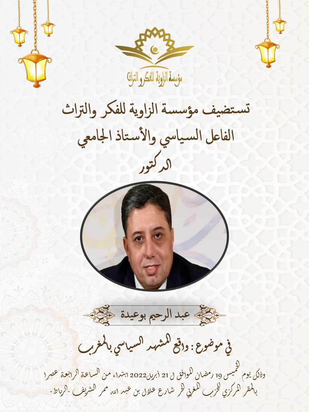 تستعد مؤسسة الزاوية للفكر والتراث لإستضافة الفاعل السياسي والأستاذ الجامعي الدكتور عبد الرحيم بوعيدة في مجالسها الرمضانية يوم الخميس 21 أبريل 2022 الموافق 19 رمضان 1443 بالمقر المركزي للحزب المغربي الحر على الساعة الرابعة عصرا.