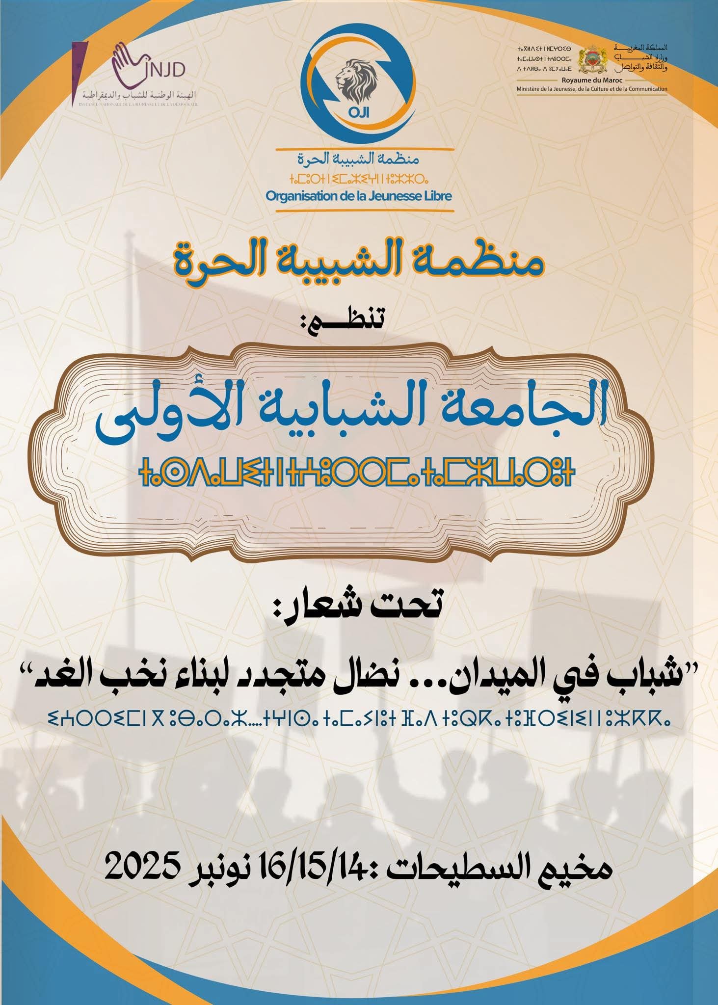 تنظم منظمة الشبيبة الحرة فعاليات الجامعة الشبابية الأولى تحت شعار: “شباب في الميدان… نضال متجدد لبناء نخب الغد”، وذلك أيام 14 و15 و16 نونبر 2025 بـ مخيم السطيحات.
